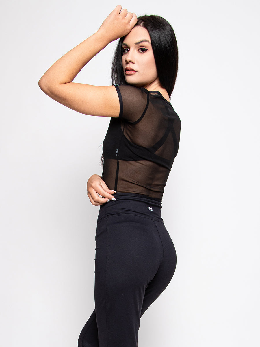 Get this really girly and sexy short-sleeved polo shirt made of elastic black tulle. You can choose from a variety of sports bras, which you can wear under it as part of a casual outfit, even with jeans. In classic black, excellent quality!