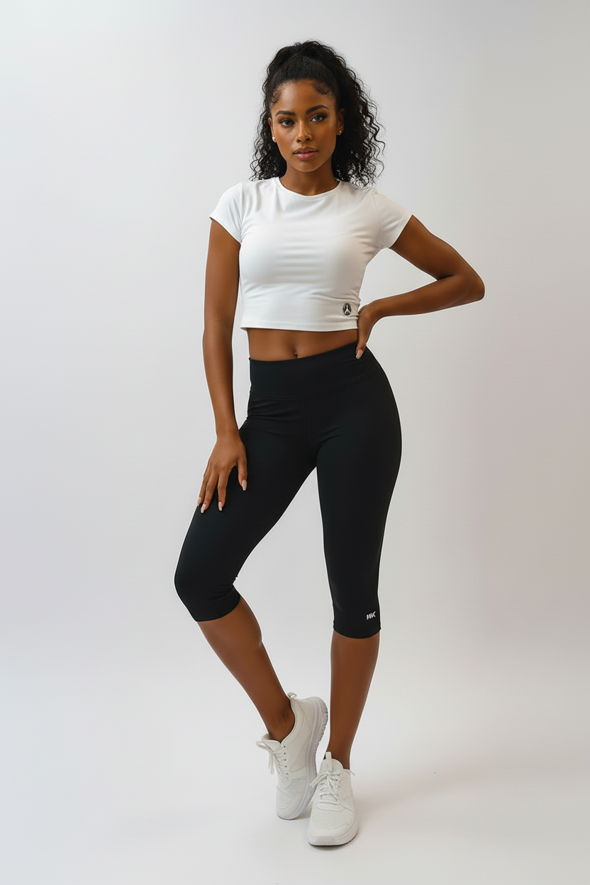 Black, women's fully fitted sports knee-length pants. Fitted, high waist, printed with a reflective Frenetic pattern at the knees. Very pleasant to the touch fitness knee-length pants.