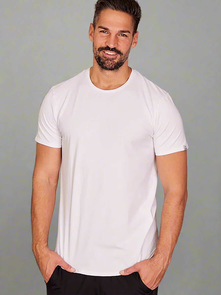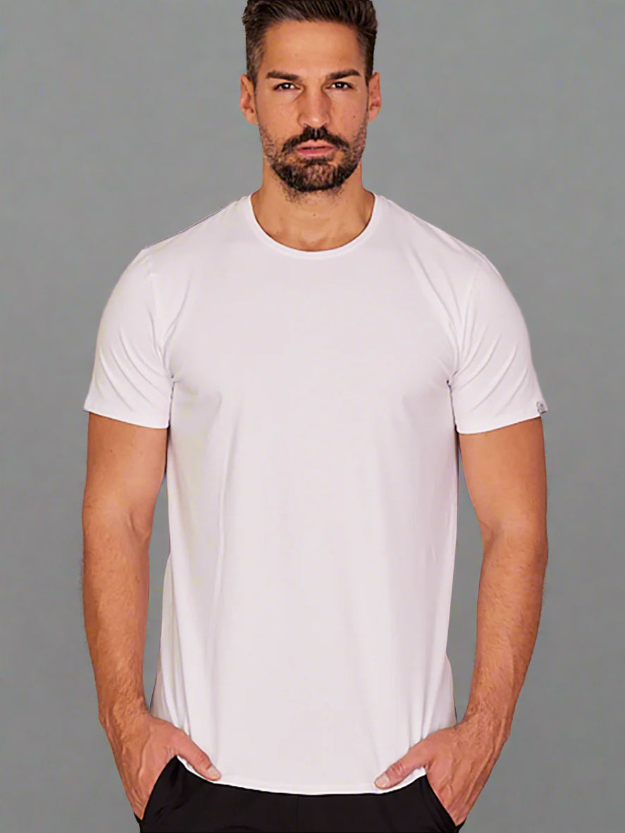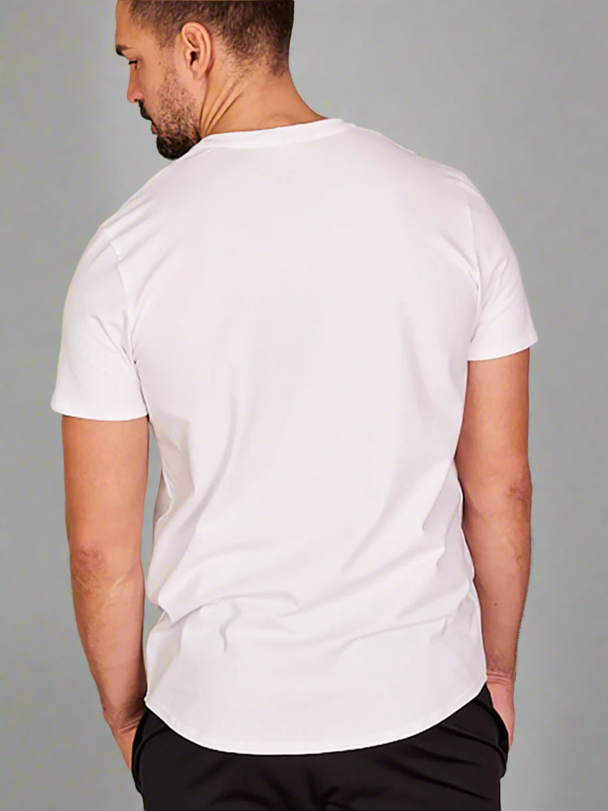 FEHÉR színű elasztikus pamutból készült, divatos férfi poló. Alja enyhén ívelt.