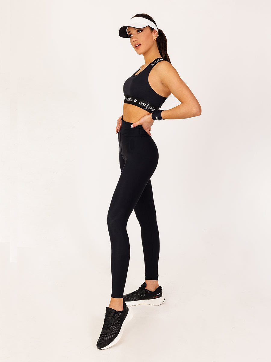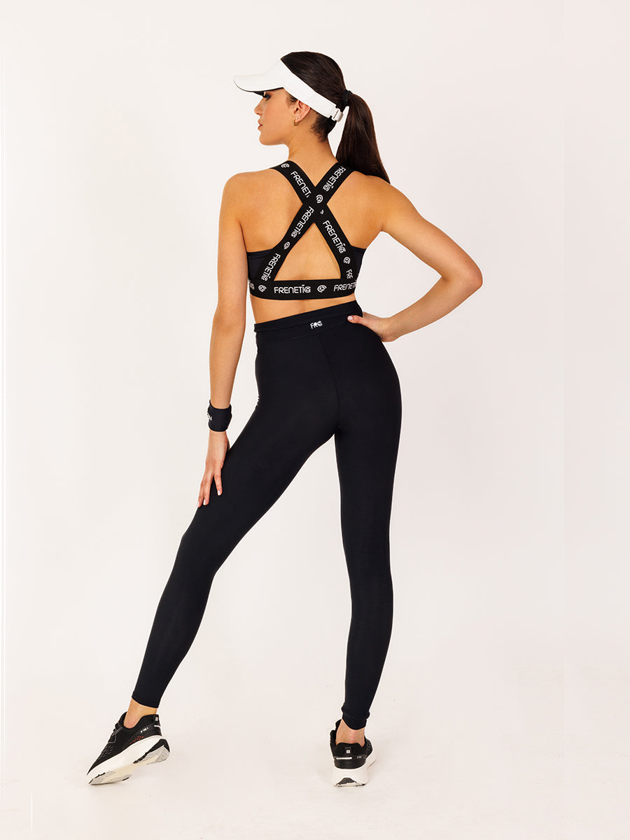 High-waisted, black fitness leggings, fitted all the way to the body, with a white Frenetic logo on the waist. A comfortable basic piece, can be worn with a sports bra, fitness tank top, or even a t-shirt.