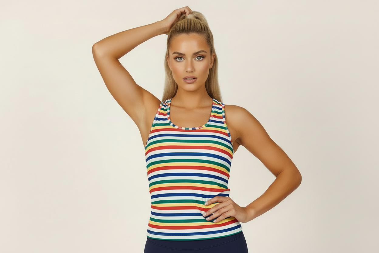 We have created this multi-colored, striped fitness wrestler for you, which gives a perfect and decorative look! Thanks to its elongated cut, it is an extra comfortable wrestling back top that is even more unique and emphasizes your feminine figure even more. The best motivation to train in.