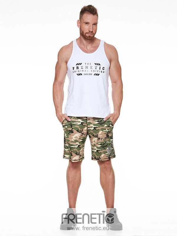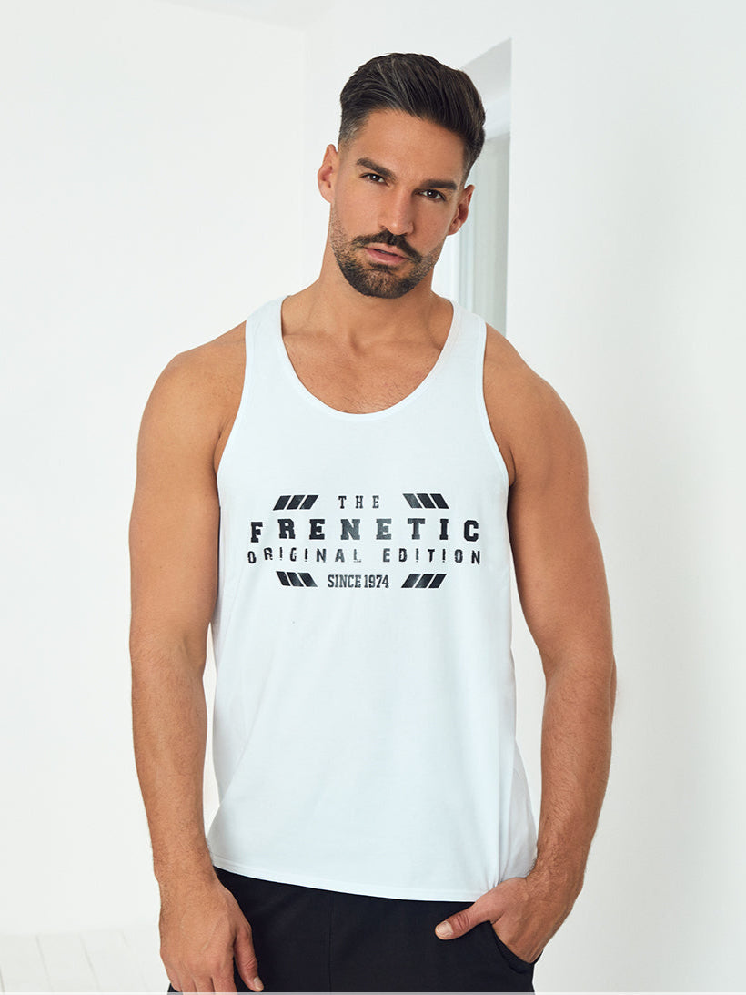White, sleeveless, unisex cotton training tank top. Wrestling singlet style on the back, with white FRENETIC lettering on the front. Casual, comfortable with wide armholes for freedom of movement. Casual wear for boxing or a hearty aerobics class.