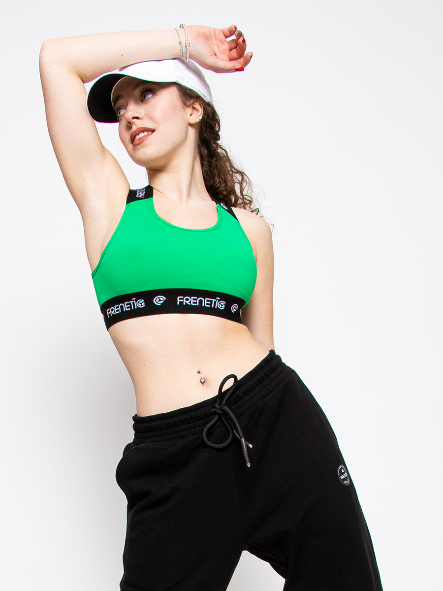 Zöld színű, keresztpántos sportmelltartó, alján Frenetic logos gumival. Magas és alacsony intenzitású sporttevékenységhez terveztük neked ezt a kivehető szivacsbetétes sportmelltartót. Egyaránt ajánluk, futáshoz, rúdtánchoz, boxoláshoz és súlyzós edzésekhez is. Kiemelkedően puha tapintású polyamid alapanyaga, izzadségelvezető, jól lélegző és antibakteriális. A gumirozott alsó szegély és keresztpántok, nem súrolják bőröd, így hosszútávfutóknak is ajánljuk a terméket. Teljes mozgásszabadságot biztosít számodra edzés közben.