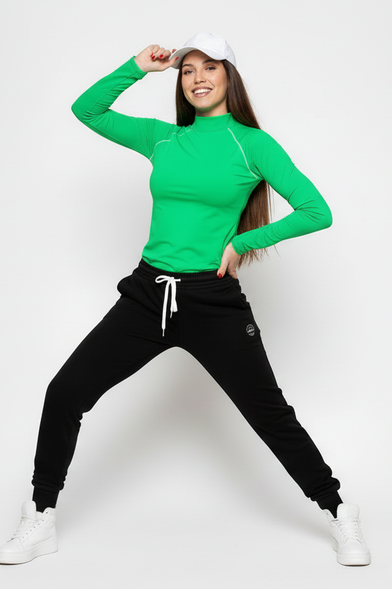 Kényelem, funkcionalitás? Jó választás ez a csodás zöld színű, enyhén magasított nyakú női hosszú ujjú sport felsőnk.