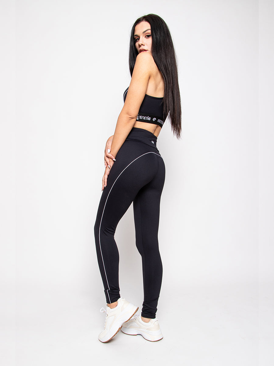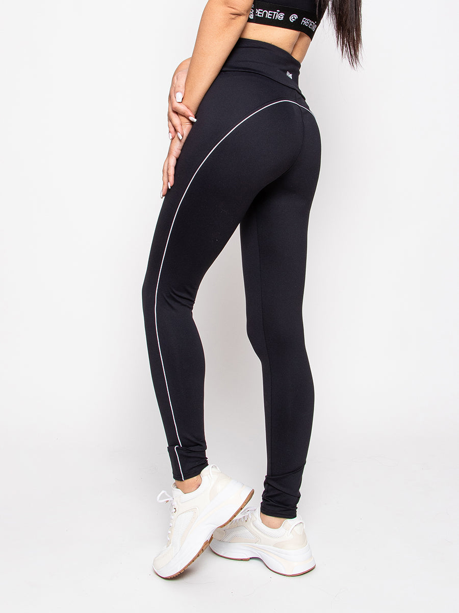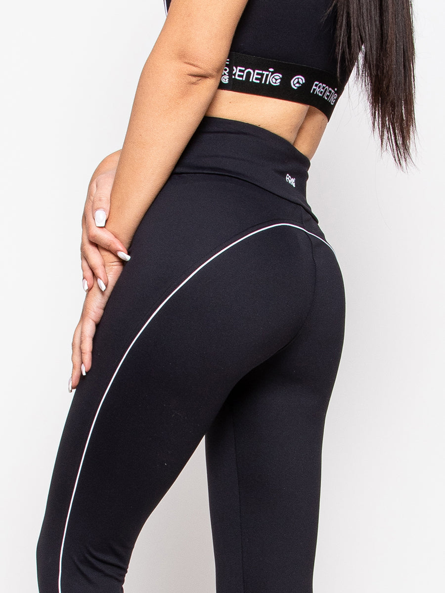 Fekete magas derekú, elasztikus alapanyagú női fitness leggings. Oldalán és derekán fehér paszpol csíkkal varrott, derék részén kicsi Frenetic logoval.