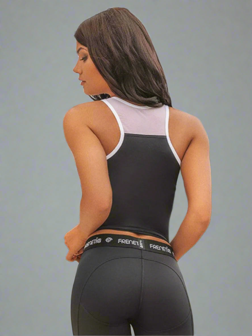 Fekete színű, egyedi tervezésű, elasztikus fehér tüll betétes trikónk most minden képzeletet felülmúl ! Egyedi formatervezés jellemzi, melynek köszönhetően a női vállak szépsége senki számára nem marad rejtve! Ha szereted a fehéret, vagy edzés közben szívesen viseled, válassz egyet Te is belőle magadnak! Alján diszkrét fekete frenetic logóval készült sport trikó, mely csinos, és kényelmes alapdarab. Anyagösszetétel: 90% polyamid 10% elastan
