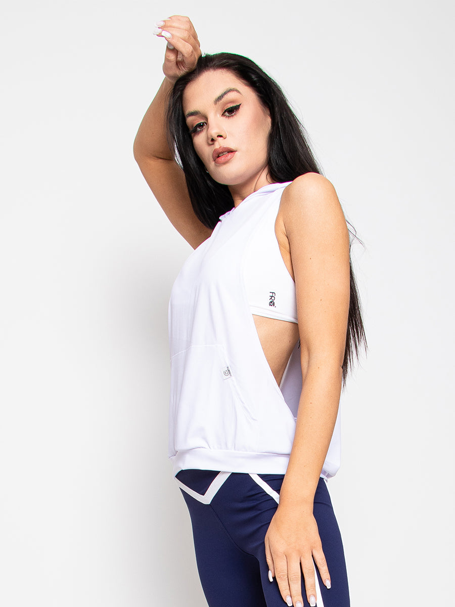 Fehér színű laza fazonú női sport mellény, elején kenguru zsebbel, elasztikus poliester anyagból. Sportmelltartóval viselve akár edzőterembe, vagy farmerral kiegészitve egy laza nyári outfit szetted lehet.