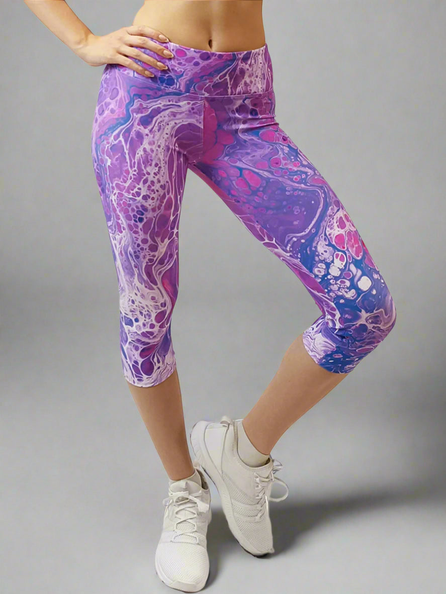Veselé, fialové basic vzorované dámske nohavice po kolená s vysokým pásom.