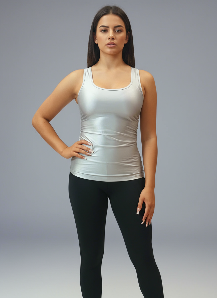 Elegancia és dinamizmus egyetlen mozdulatban! Ez a ragyogó ezüstszínű birkózó hátas trikó nemcsak a figyelmet vonzza, hanem kényelmes viseletet is nyújt az aktív életmódhoz. A rugalmas, testhez simuló anyag tökéletesen követi az alakot, miközben maximális szabadságot biztosít minden mozdulatnál.