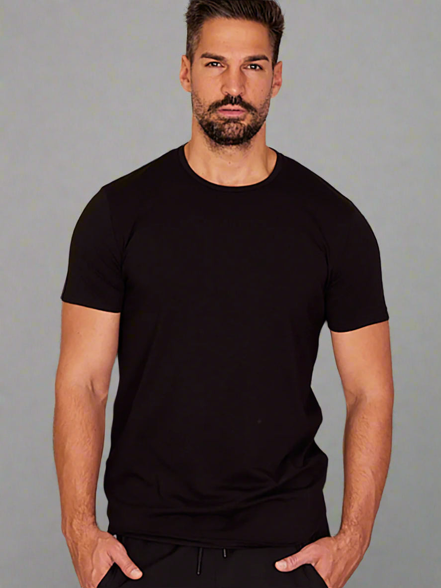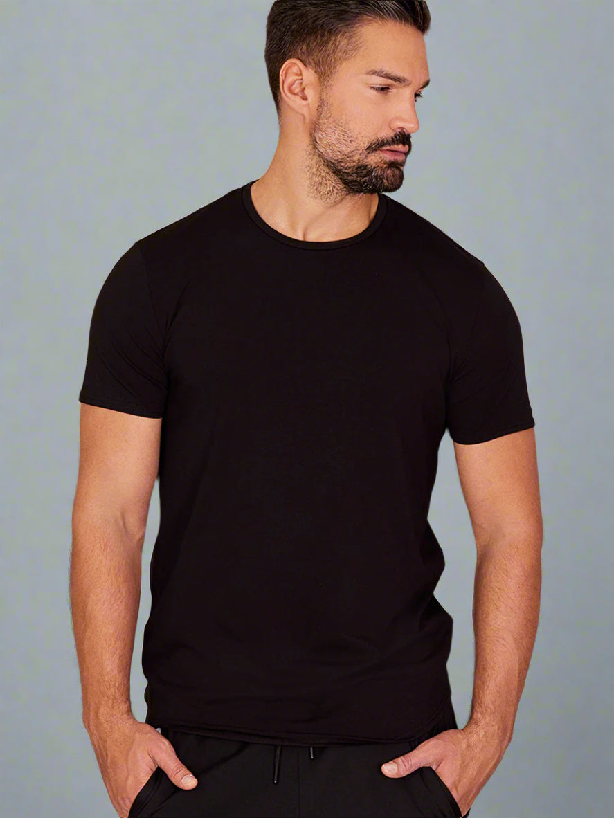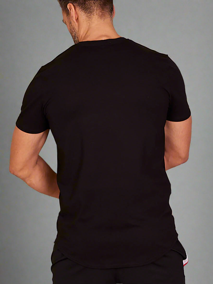 Fekete színű elasztikus pamutból készült, divatos férfi poló. Alja enyhén ívelt.