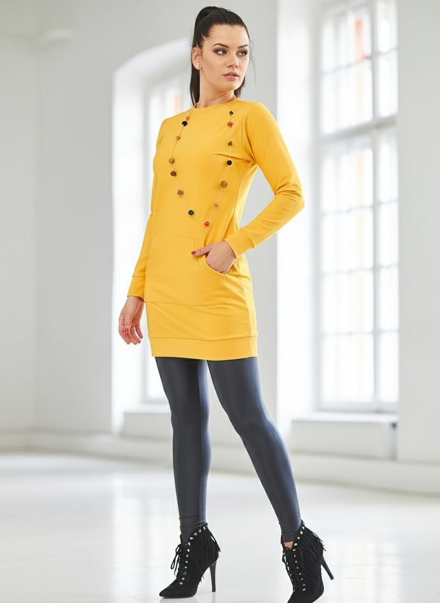 Módne dámske minišaty v žltej farbe s klokaním vreckom vpredu. Dĺžka do polovice stehien, mierne ležérny štýl, dlhé rukávy a okrúhly výstrih. So špeciálnou FRENETIC výšivkou na chrbte, ktorá pokrýva takmer celý chrbát. Naše dámske minišaty môžete nosiť na vysokých podpätkoch, ale perfektne sa hodí aj k trendy teniskám. Vyberte si jednu z našich jednofarebných legín k sebe, na obrázku sme ju skombinovali s nohavicami LISA s koženým efektom, ktoré tvoria osobitý celok. KATEGÓRIA PREMIUM, - vysoké požiadavky na kvalitu Jedinečné plánovanie a DIZAJN Pohodlné materiály šetrné k pokožke