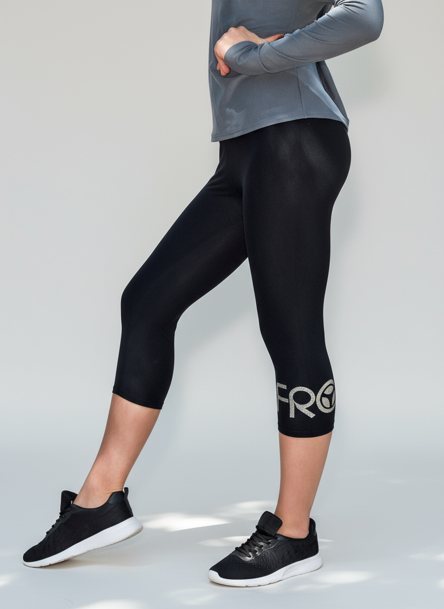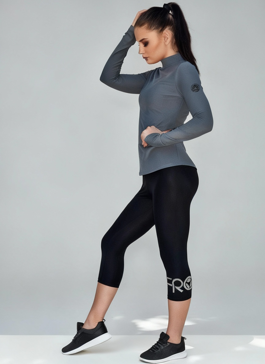 Klasické línie, nadčasová móda! Naše čierne dámske nohavice po kolená sú vyrobené z obľúbeného materiálu našich predtým známych nohavíc NIKKO, DARB a HELIX, ktorý má mierne plyšový vonkajší povrch jemný na dotyk. Vyšší strih do pása, ktorý siaha takmer po líniu pupka, s elastickým pásom. S trblietavou striebornou potlačou na lýtku. Veľmi pohodlné, na dotyk naozaj mäkké nohavice po kolená, ktoré odporúčame na hodiny pilatesu, jogy alebo aj telocvične. Úspech je zaručený.... Vyrobené v PREMIUM kvalite s príjemným nadýchaným povrchom BREATHABLE - látky absorbujú pot a umožňujú prirodzené odparovanie.