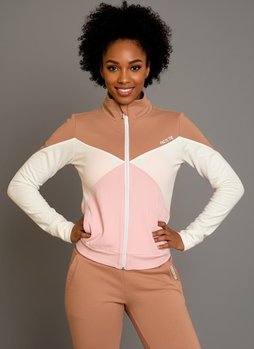 Táto púdrovo ružová/pieskovohnedá/biela tepláková súprava je vyrobená z tenšieho materiálu ako štýl STRIPS, vďaka čomu je ideálnou voľbou na letný večer.